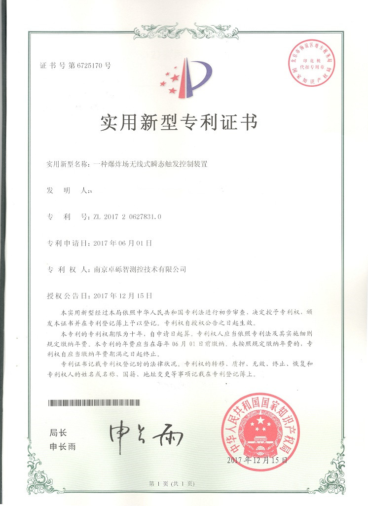 【實(shí)用新型專(zhuān)利證書(shū)】一種爆炸場(chǎng)無(wú)線式瞬態(tài)觸發(fā)控制裝置